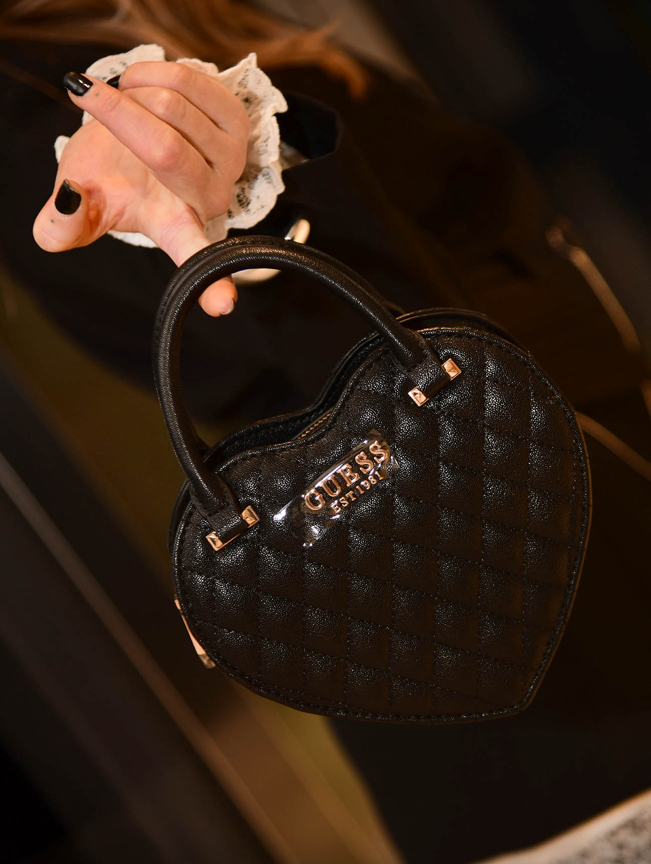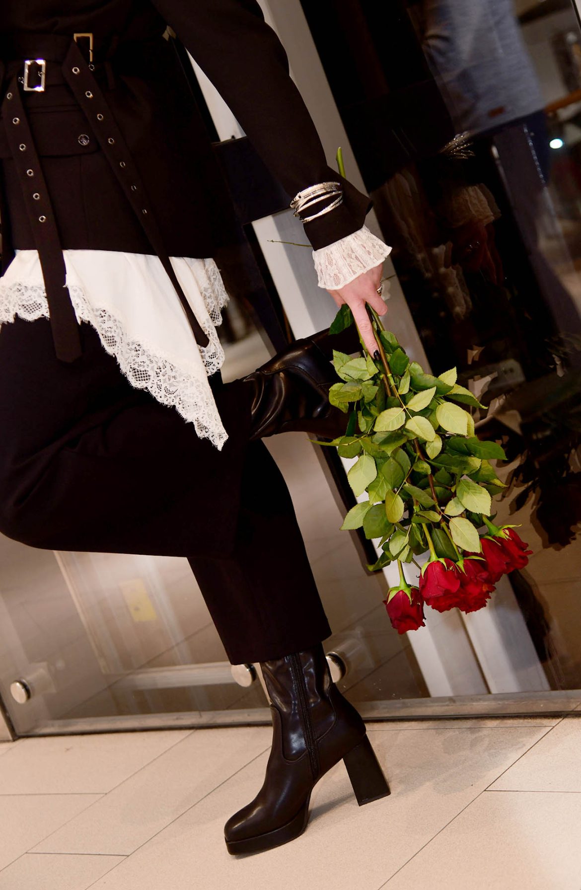 Njezin crni styling sastoji se od statement sakoa s remenjem, čipkastog topa te robusnih čizama. Točku na “i” ovom jedinstvenom looku pridonijeli su modni dodaci: torbica u obliku srca, narukvice u srebrnoj boji, ogrlica s privjeskom srca zakačena na džep sakoa te crne naočale. Sviđa nam se ova mračna romantika!